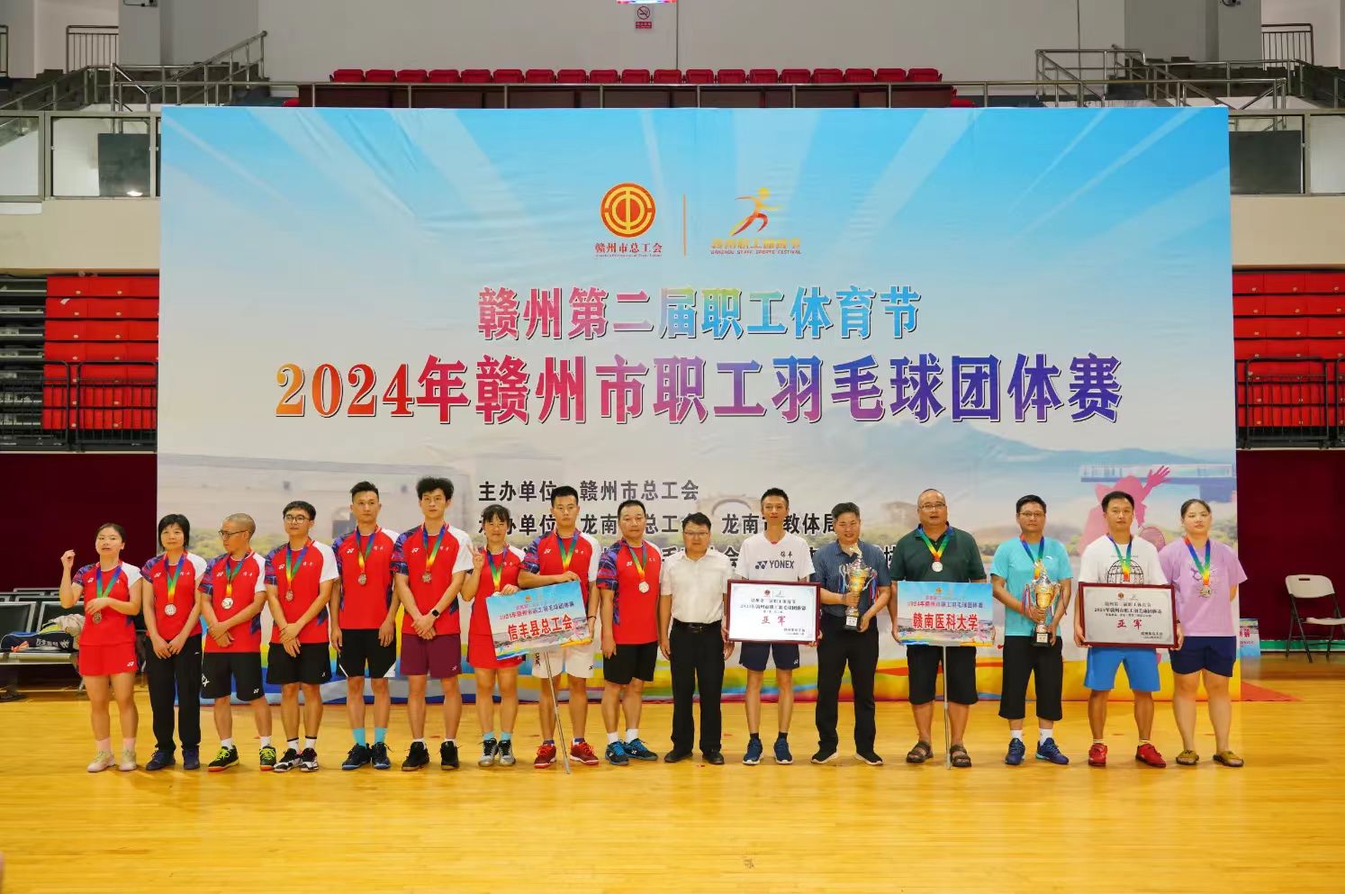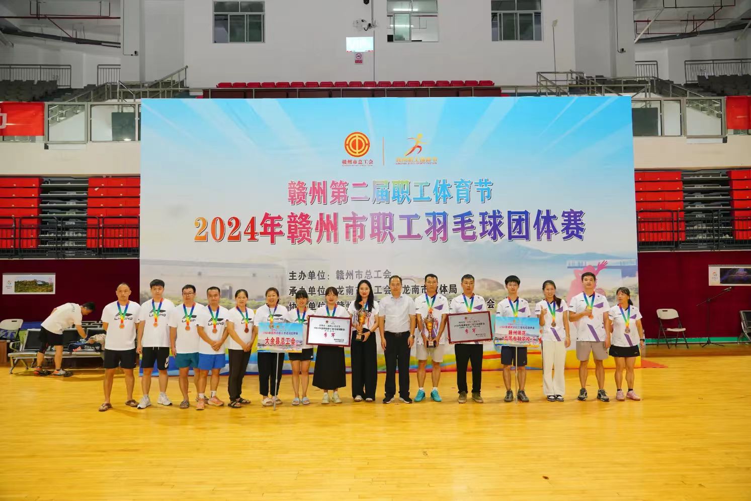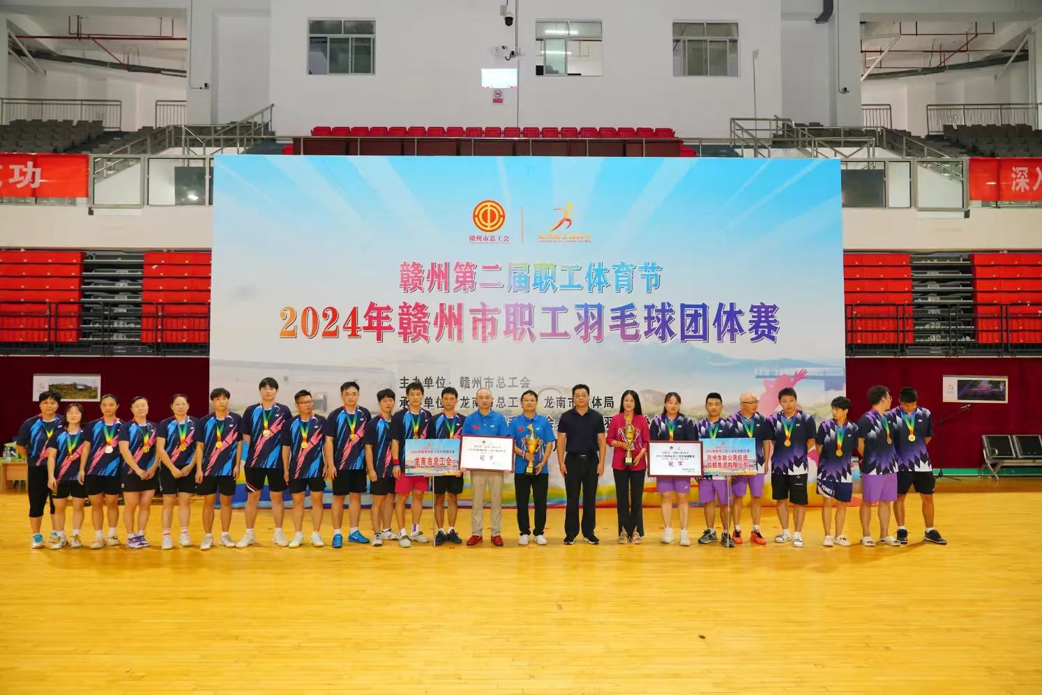 8月22日下午,2024年赣州市职工羽毛球团体赛颁奖仪式在龙南市体育中心举行。经过3天305场紧张激烈的比赛角逐,最终,龙南市代表队、赣州市政公用投资控股集团有限公司代表队分别摘得县(市、区)组和市直(驻市)组冠军,信丰县代表队、赣南医科大学代表队分获亚军,大余县代表队、赣州师范高等专科学校代表队分获季军。赣州市总工会党组副书记、常务副主席刘文杰,党组成员、副主席何敏,龙南市领导廖东根、陈宝权、王惠敏为获奖代表队颁奖。
