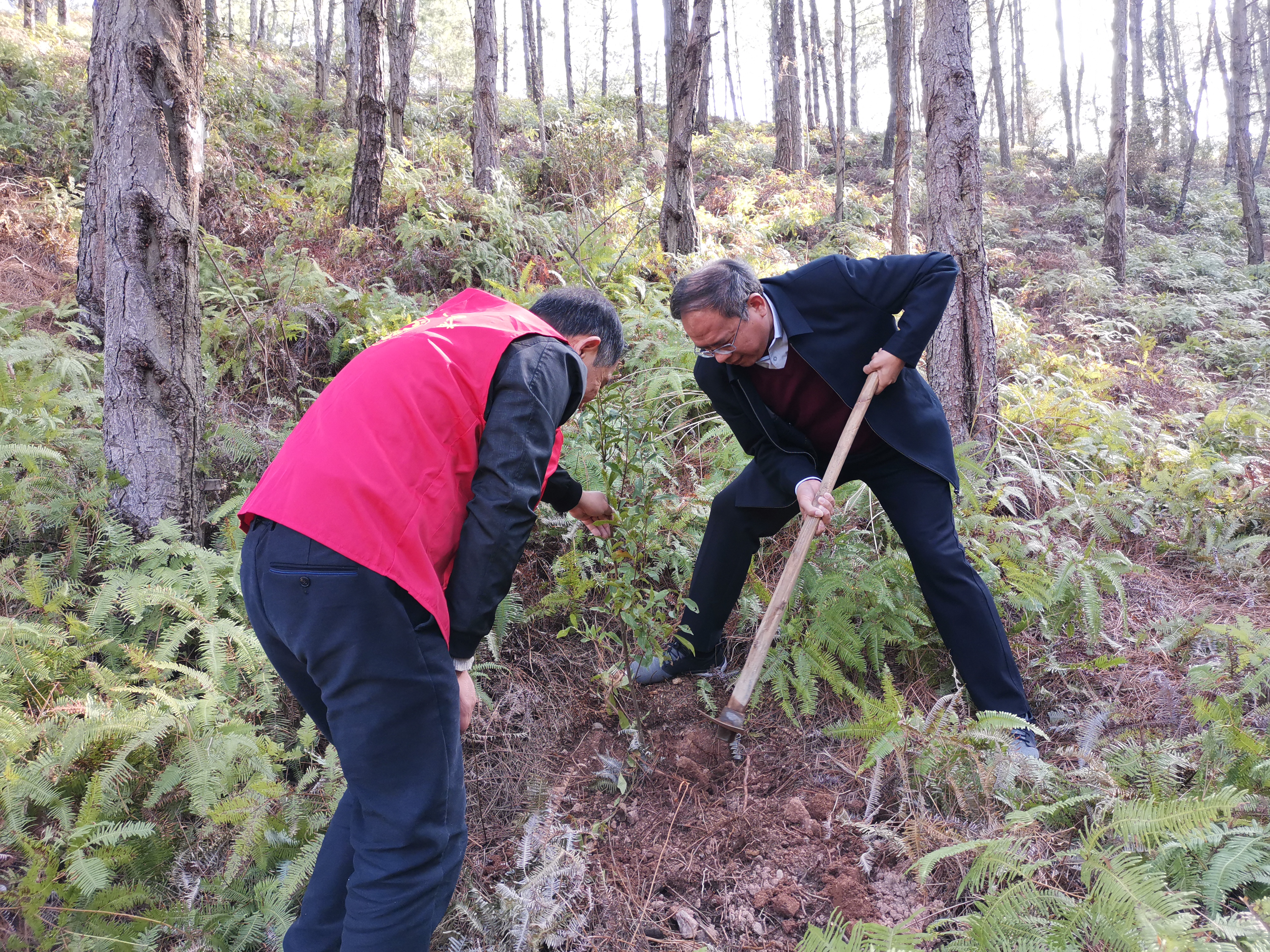 植树活动现场,干部职工们充分发挥不怕苦不怕累的精神,爬上山坡光秃处,拿着铲锄,提上水桶开始忙碌起来。他们有人抬树,有人扶树,有人培土,有人浇水,按照“三填二踩一提”的植树技术,默契配合,栽下一株株希望的小树苗。